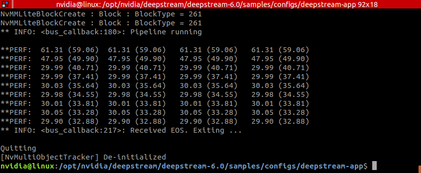 DeepStream sample 종료 후에, 터미널에서 4개의 video stream 의 fps 를 Log 로 확인할 수 있다.