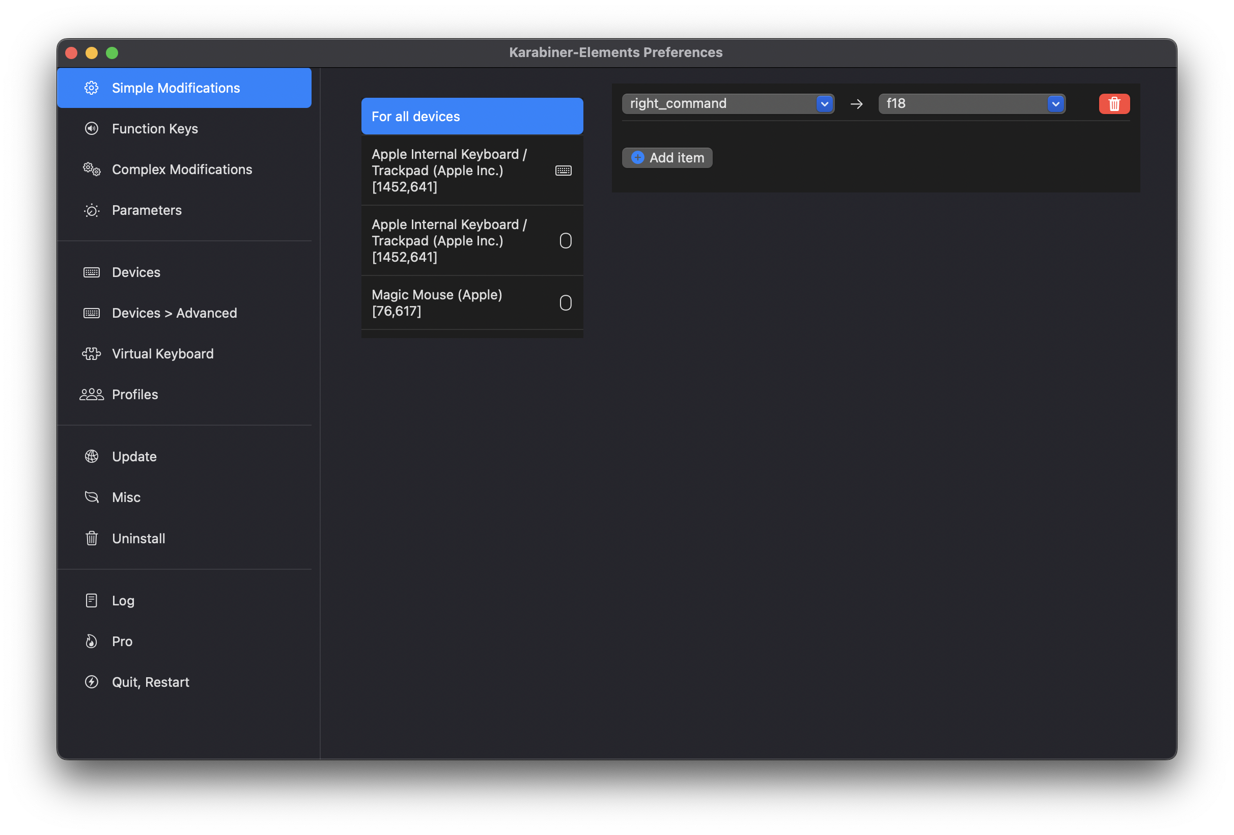 karabiner 실행 후, Simple Modifications 항목에서, right_command 를 f18 로 설정 합니다.