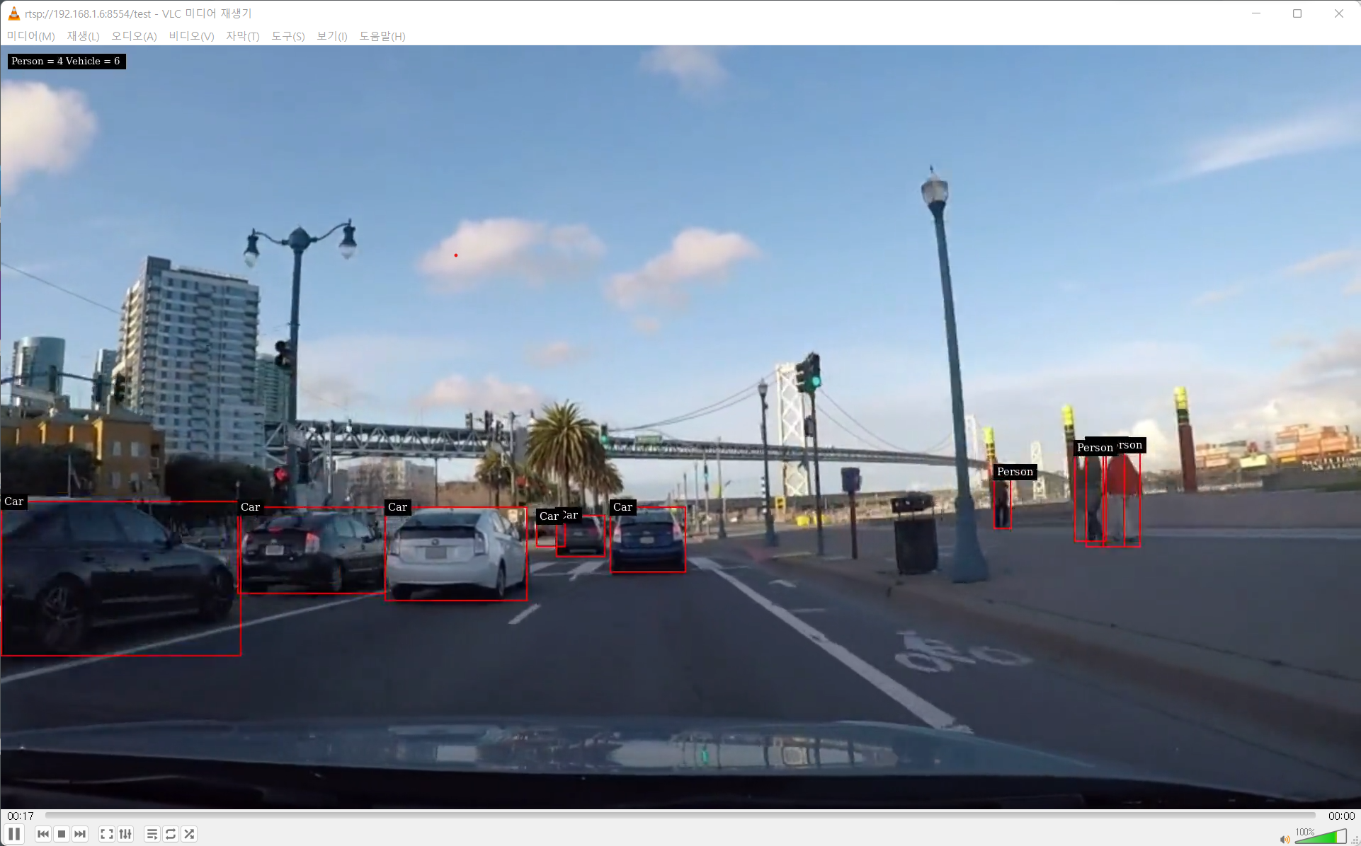 네트워크 스트림 (rtsp://ipaddress/test) 를 열면 다음과 같이 NX devkit 에서 객체검출을 수행하는 결과를 볼 수 있다.
