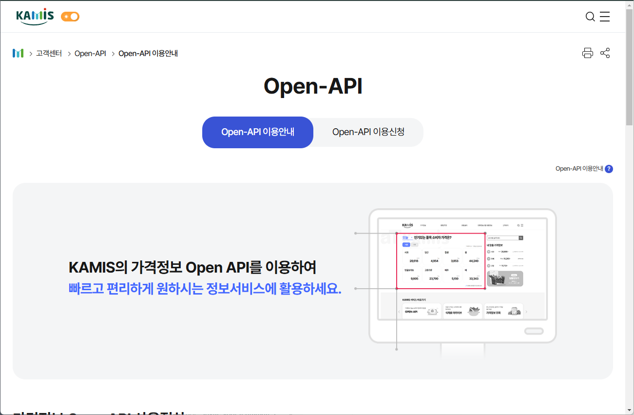 KAMIS 공식 웹사이트(https://www.kamis.or.kr/customer/main/main.do)에 접속합니다.